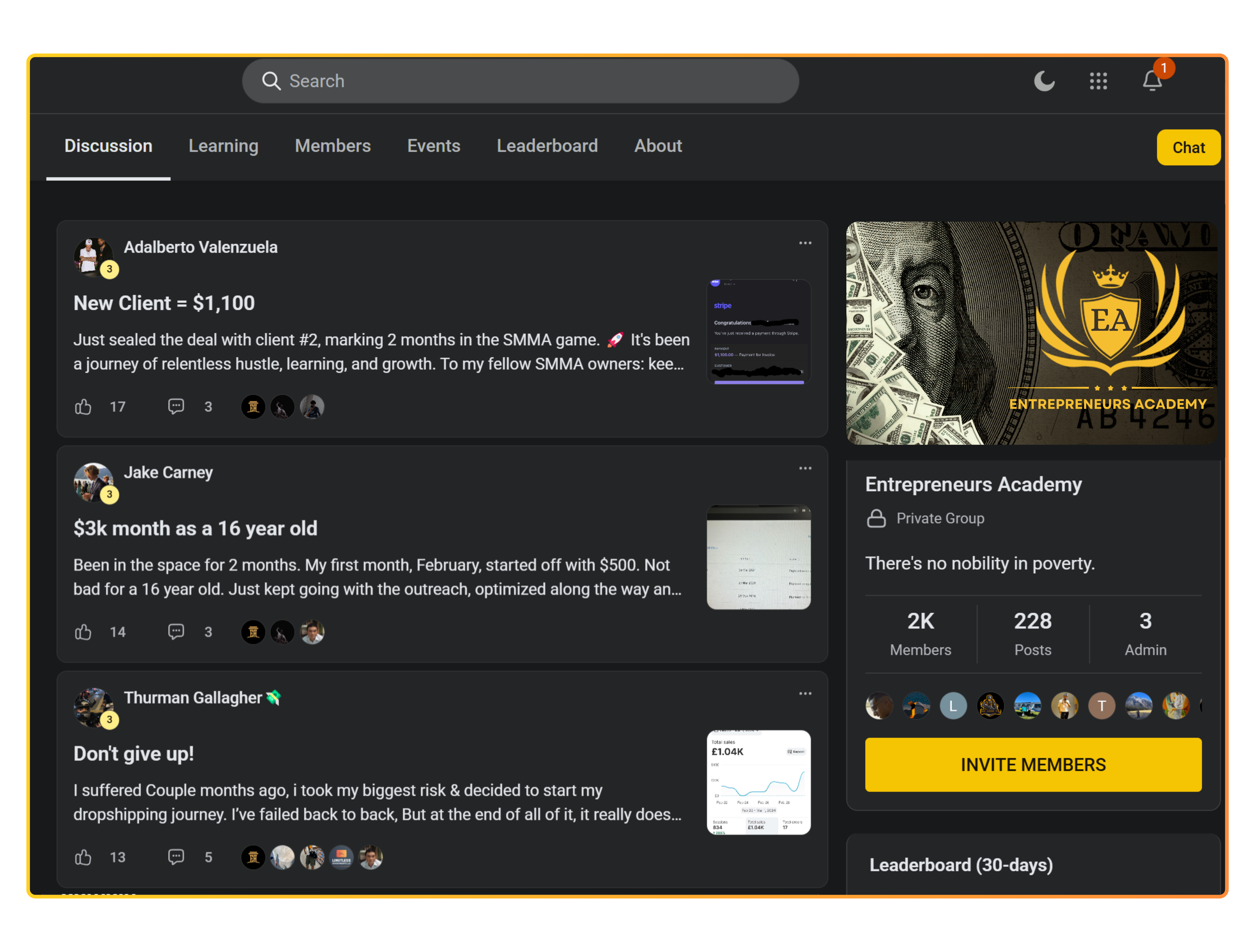 Entrepreneurs Academy is an online community offering courses, mentorship, and resources to actually help you build profitable online businesses. We cover a range of models, from dropshipping to SMMA and beyond.