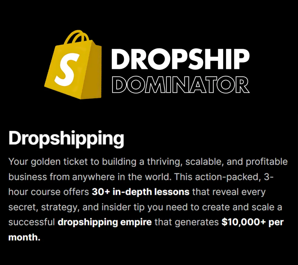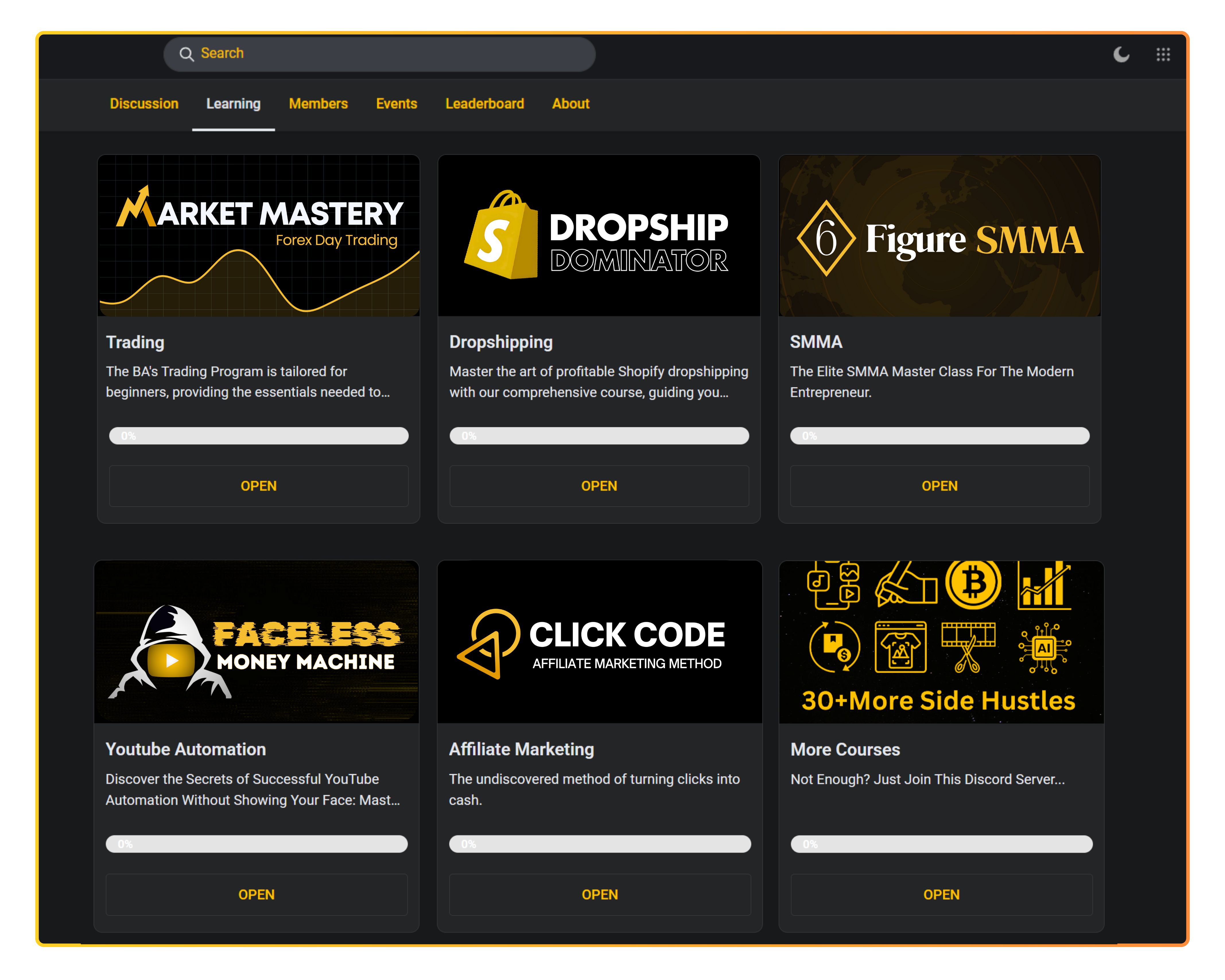 Our community provides in-depth courses on Dropshipping, SMMA, YouTube Automation, Forex Trading, Affiliate Marketing and more.
